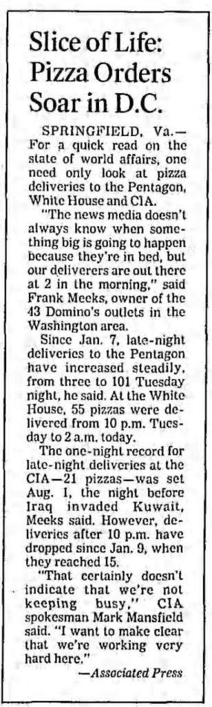 例如1990年8月2日伊拉克入侵科威特,前一天晚上中情局便訂了破紀錄的21份披薩。這篇新聞指出從1月7日開始,白宮與五角大廈深夜訂購披薩的數量又迅速增加,到了1月15日這一天,白宮在晚上10點到凌晨2點間,就訂了55份披薩,五角大廈更從平時一晚3份,增加到101份。