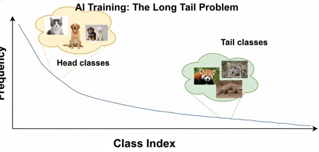 在餵資料給AI模型進行訓練時,就會遇到長尾問題。以動物這個類別來說,大部分的圖片都是貓、狗,這樣訓練出來的AI可能就無法有效識別其他動物。