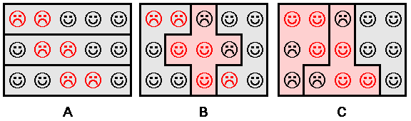 下圖是摘自維基百科的圖例,可清楚看出同樣的選民結構,在A、B、C三種不同的選區劃分方式下,黑、紅兩方的當選席次卻有3:0、2:1和1:2三種不同結果。德州的共和黨州長與議員便打著這樣的如意算盤,打算在8月初召開特別會議,通過重劃選區的法案,明年期中選舉便能不費吹灰之力,多拿下5個國會眾議院席位。