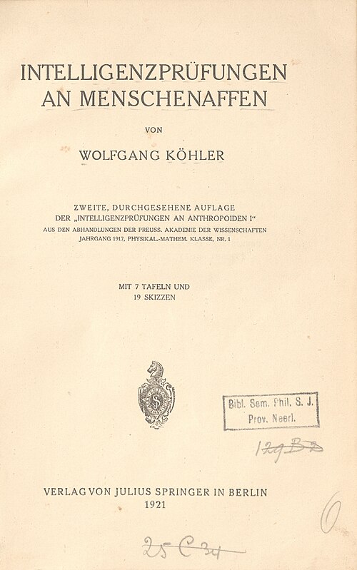 第一次世界大戰結束後,戰敗的德國無力繼續支持海外研究,科勒只好於1920年回國。第二年他總結在非洲所做的實驗,出版《人猿的心智測驗》一書,向世人揭露黑猩猩如何靈光一閃、而不是靠過去經驗解決問題。他以此挑戰主流的學習理論,並提出洞察力——或稱之為頓悟,往往才是突破困境之道。